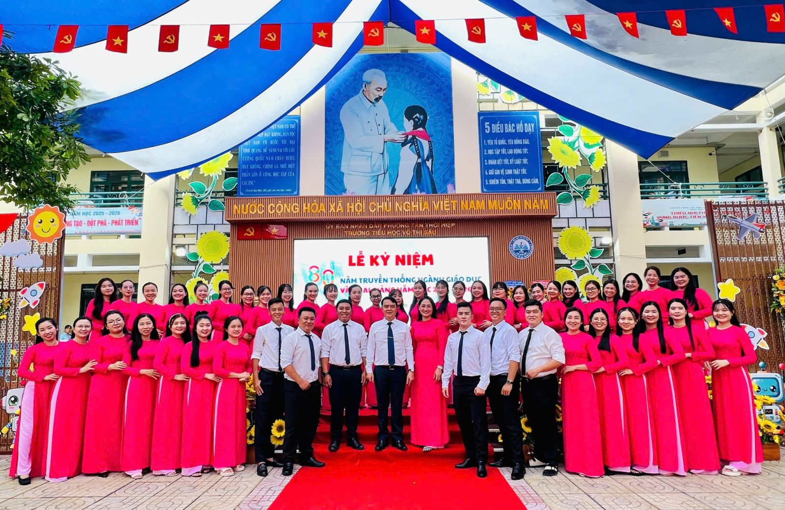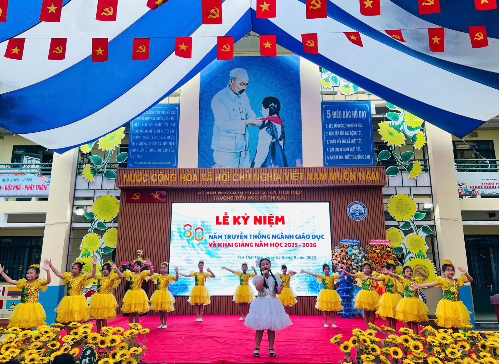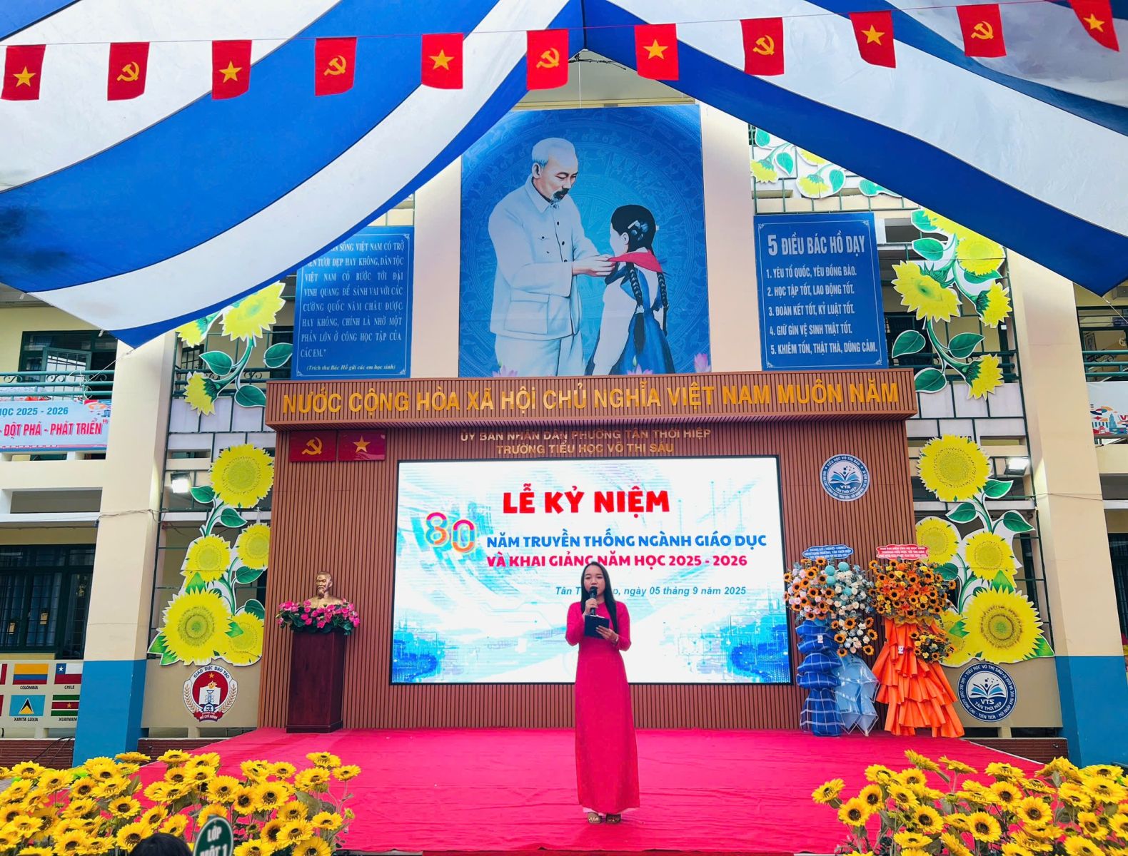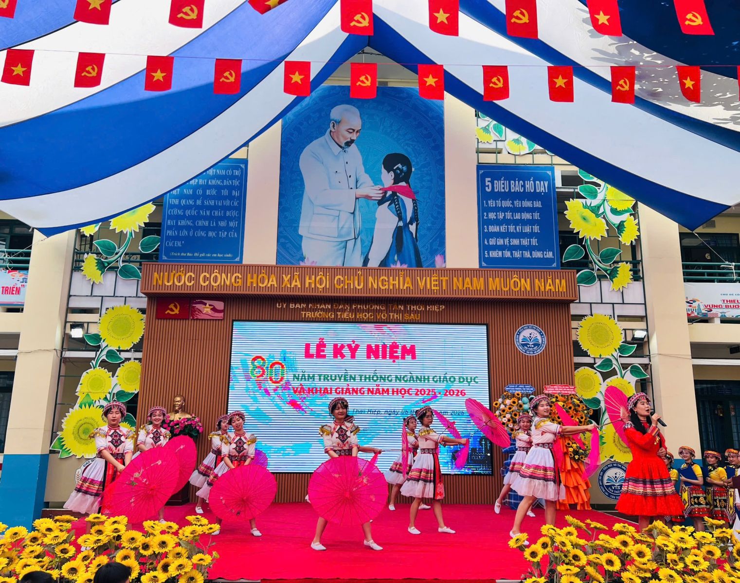 Sáng nay, ngày 05 tháng 9 năm 2025, Trường Tiểu học Võ Thị Sáu đã long trọng tổ chức Lễ Kỷ niệm 80 năm Truyền thống ngành Giáo dục và Khai giảng năm học 2025 - 2026. Đây là sự kiện quan trọng đánh dấu một cột mốc lịch sử, mở ra một hành trình tri thức mới đầy hứa hẹn.